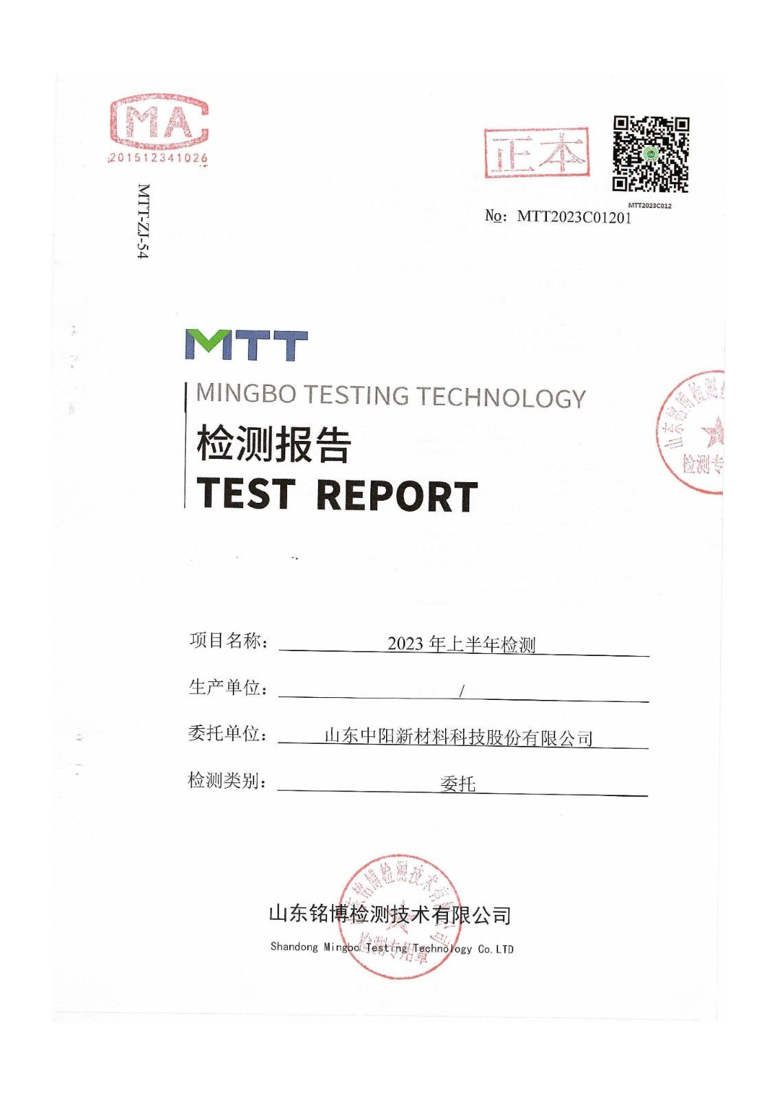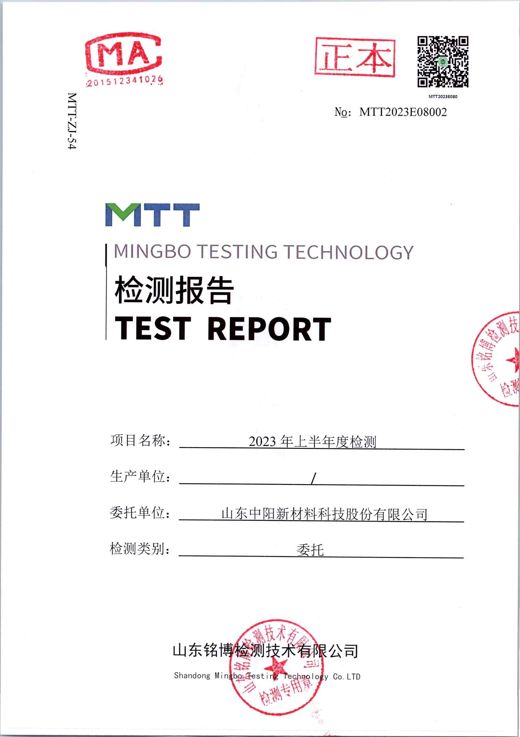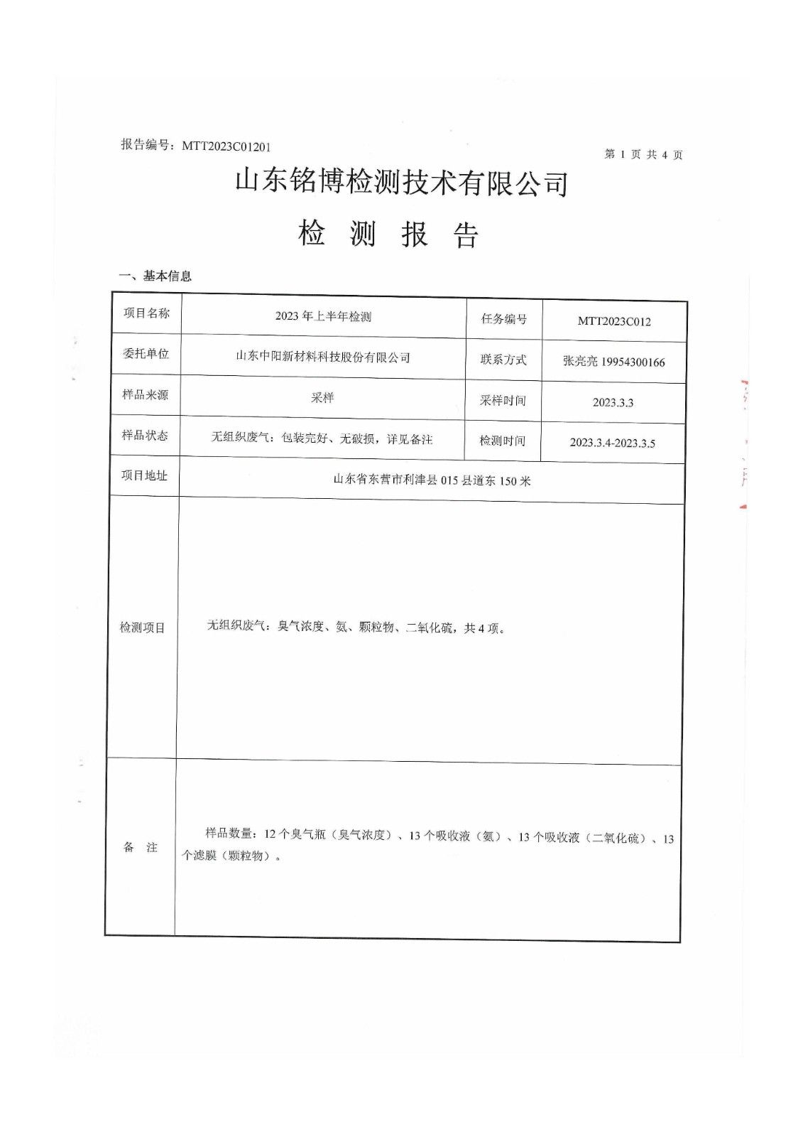 山東中陽新材料科技股份有限公司半年度廠界檢測(cè)