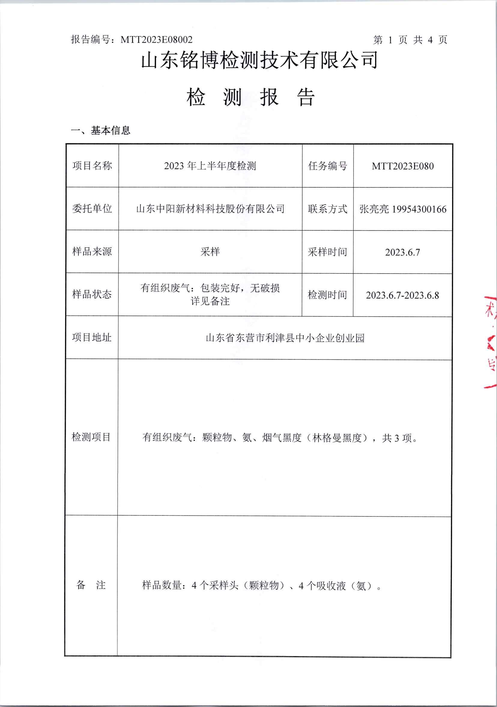 山東中陽新材料科技股份有限公司半年度廠界檢測(cè)